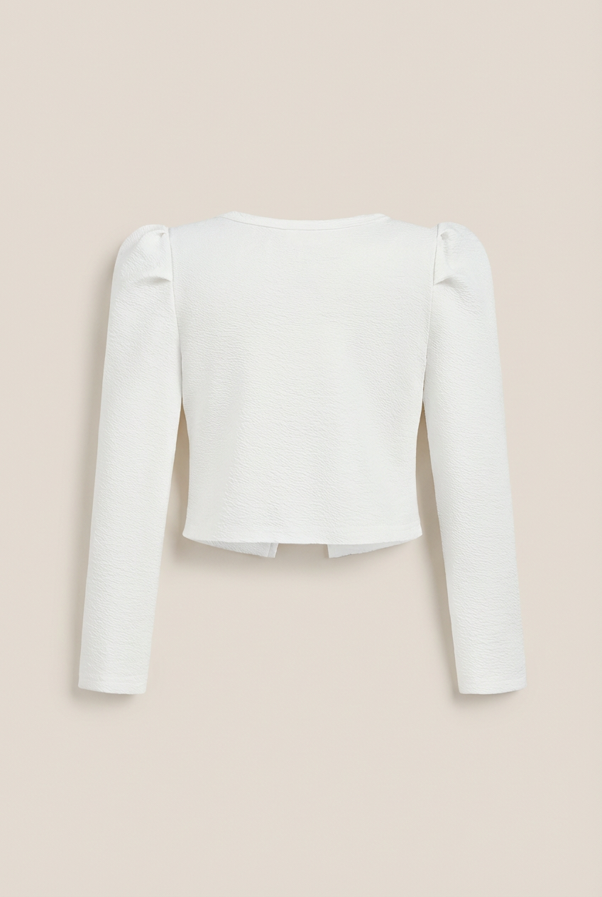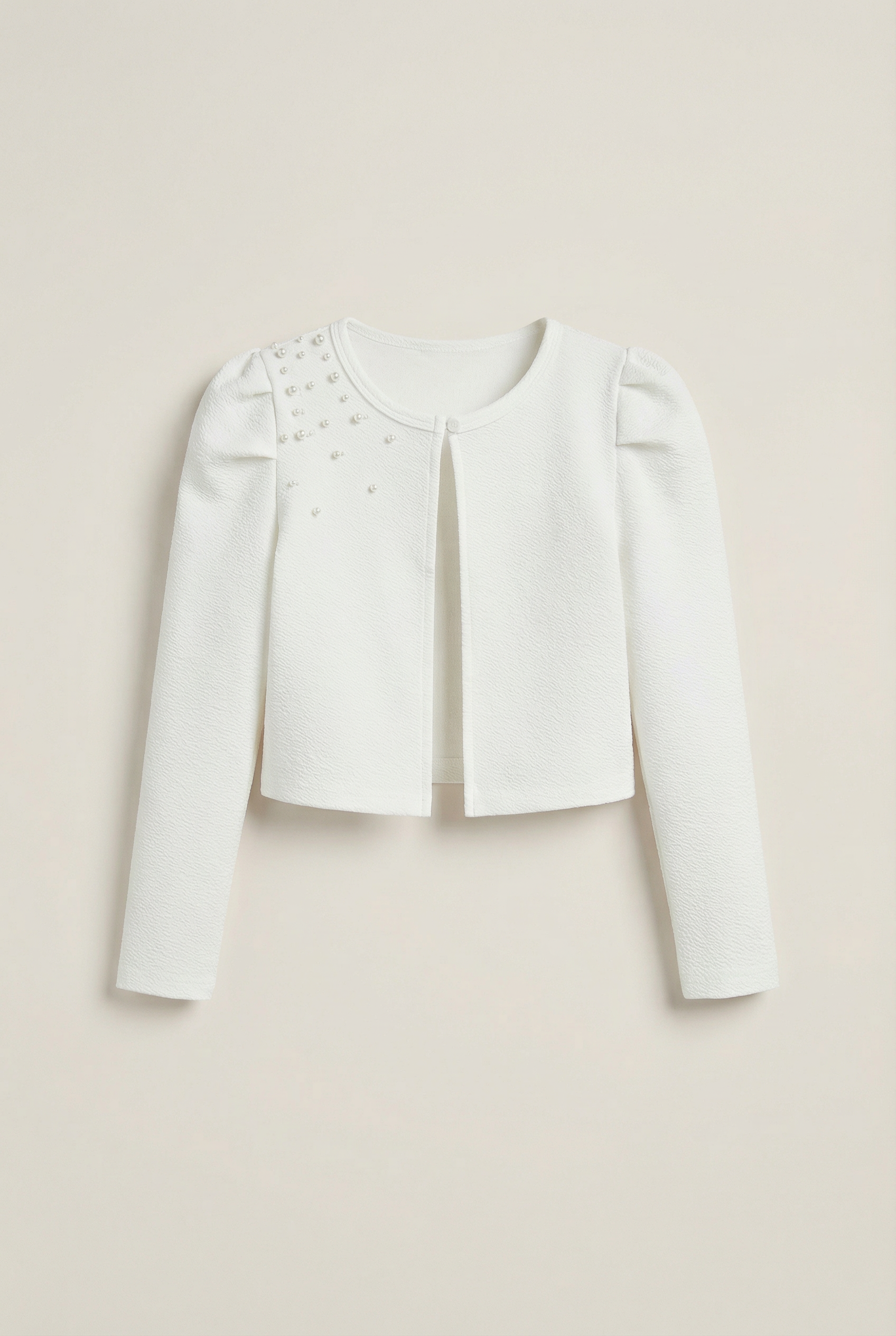 Realizzato in tessuto di alta qualità nel tono ecru, questo bolero è adatto per i giorni più freschi della primavera e dell'estate, offrendo comfort e protezione dal freddo senza sacrificare l'aspetto elegante. È la scelta ideale per la giovane signora per diverse occasioni speciali, dalle festività alle cerimonie familiari, fino agli eventi formali scolastici.