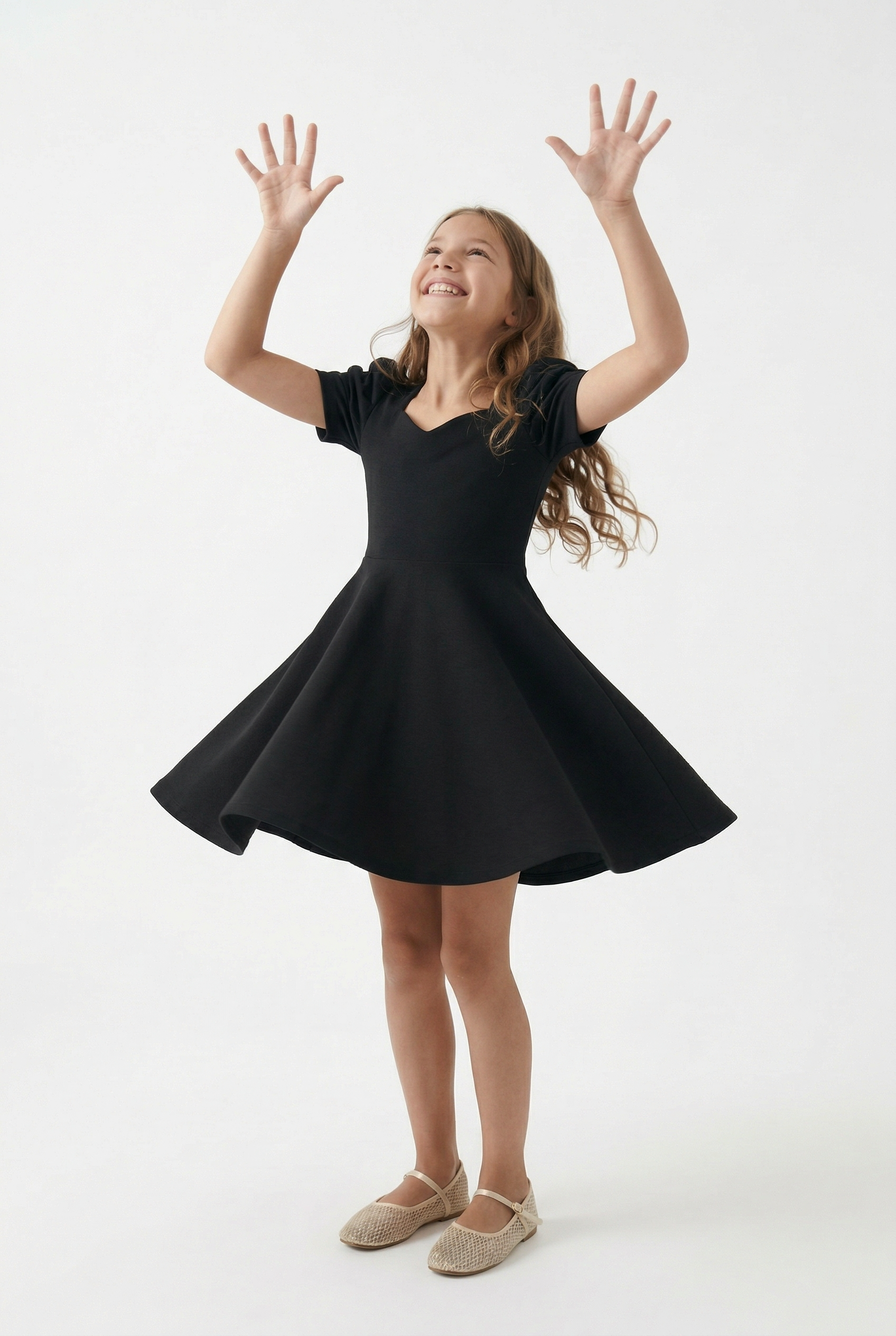 Il tessuto elastico avvolge la silhouette con naturalezza, mentre la gonna svasata con morbide arricciature in vita crea un effetto di movimento leggero e armonioso. La linea pulita e senza fronzoli rende questo vestito versatile per molteplici occasioni, dal ricevimento serale alla festa di fine anno scolastico.