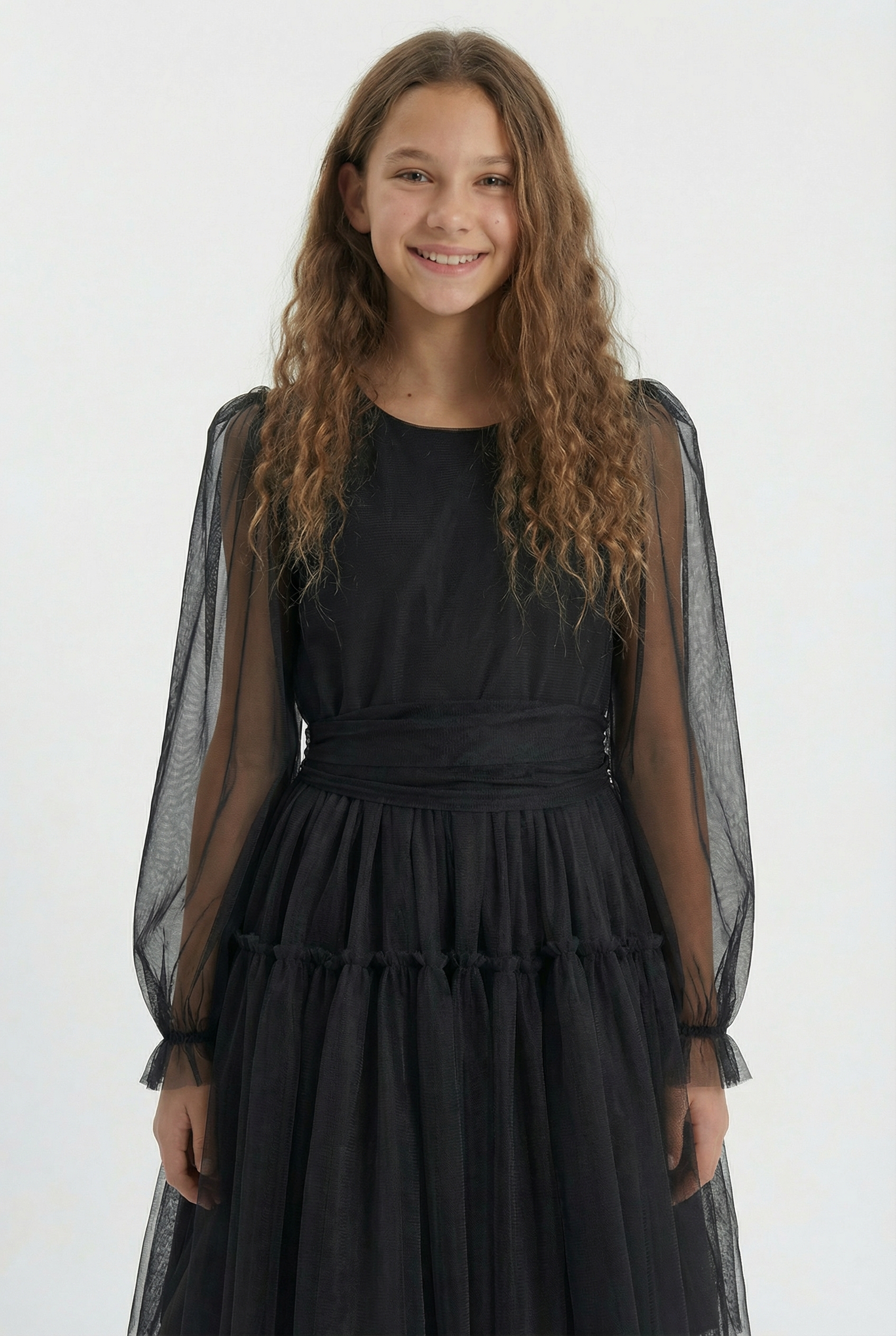 Quando la sera si accende di luci e la musica inizia a suonare, il vestito Holly avvolge la vostra bambina in un abbraccio di tulle nero che trasforma ogni momento in pura magia. Creato per le giovani ragazze che amano sentirsi speciali, questo abito è il compagno ideale per le cerimonie più raffinate.